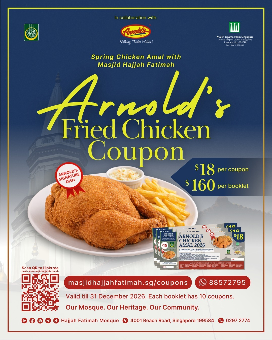 Explore our fundraising initiatives to support Masjid Hajjah Fatimah. Purchase Arnold's Spring Chicken to contribute directly to our cause. More projects will be added soon, Insha'Allah