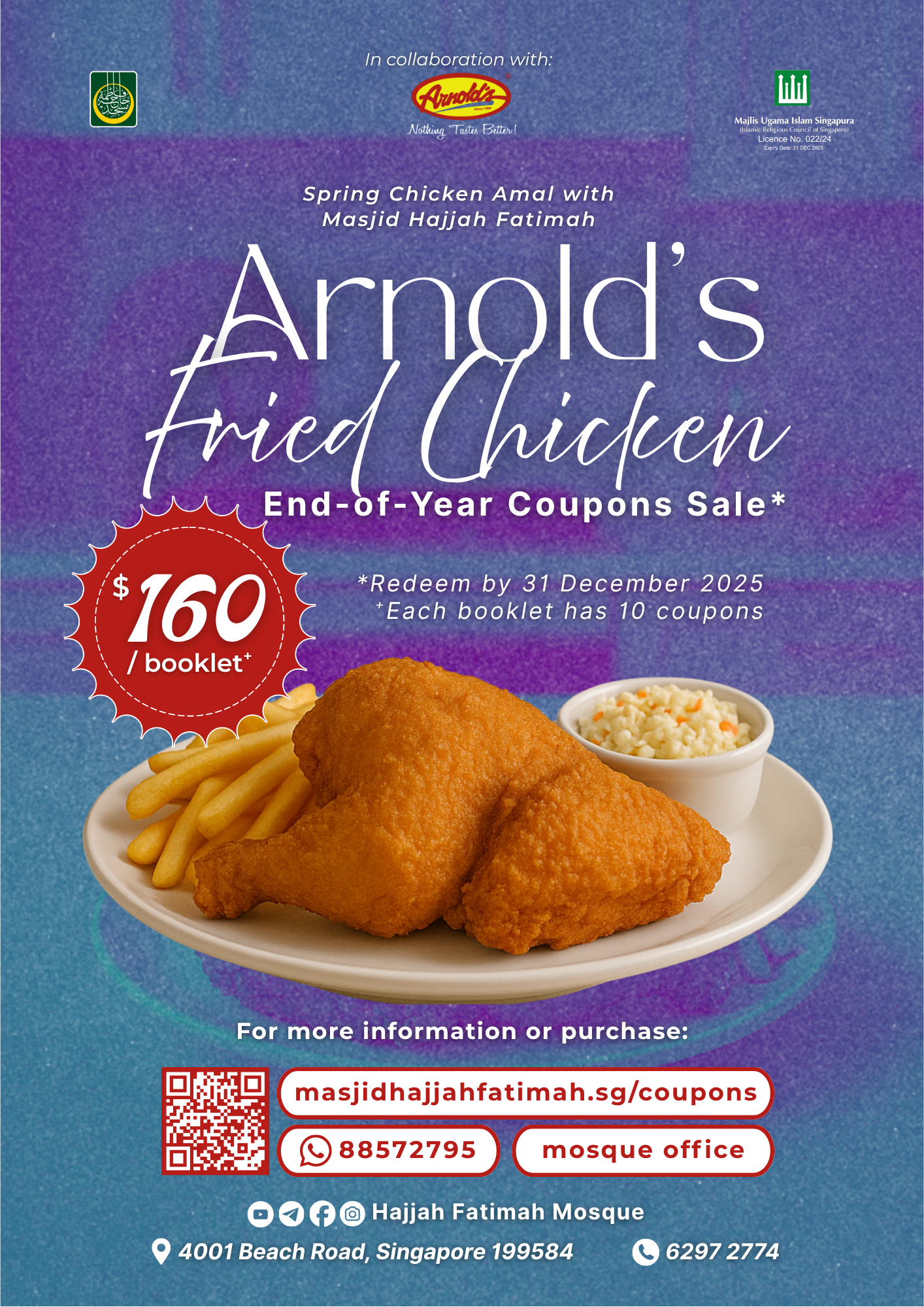 Explore our fundraising initiatives to support Masjid Hajjah Fatimah. Purchase Kurma or Arnold's Spring Chicken Coupons to contribute directly to our cause. More projects will be added soon, Insha'Allah